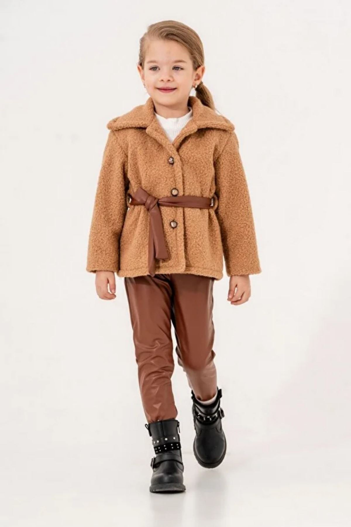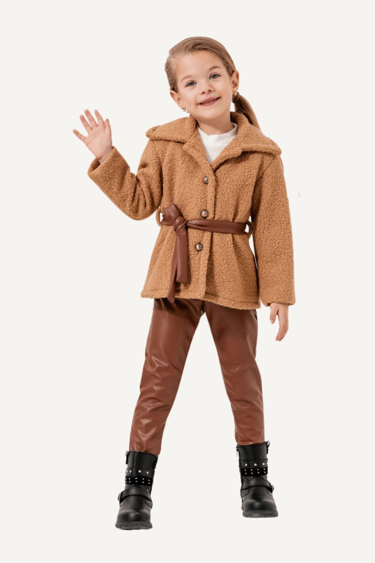 Ürün Açıklaması: Kaban: Sevimli Düğme Detaylı İçi Astarlı Yumuşacık Kaşe Kaban Üst:Yumuşacık Likralı Fitilli Badi/Sweat Alt:Belden Lastikli İçi Kadife Gibi Yumuşacık Deri Pantolon Ve Aksesuar Kemer
